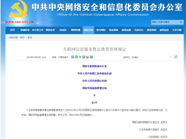 我国算法推荐政策明确落地,算法歧视、“大数据杀熟”、诱导沉迷等算法不合理应用都将在新规定下受到监管。《互联网信息服务算法推荐管理规定》(下称《规定》),由国家网信办、工信部、公安部和市场监管总局等四部门联合制定,将自2022年3月1日起施行。