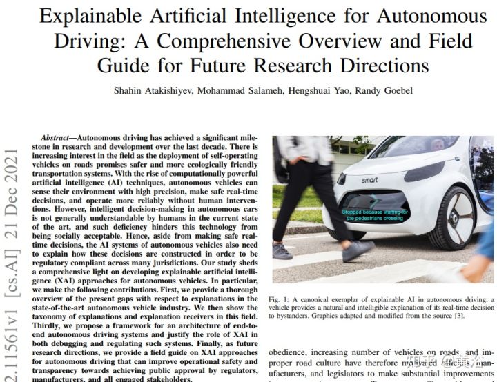 arXiv上2021年12月21日上传的自动驾驶可解释AI的综述:"Explainable Artificial Intelligence for Autonomous Driving: A Comprehensive Overview and Field Guide for Future Research Directions",作者来自加拿大Alberta大学和华为研发。