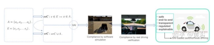 另外,作者提出一个XAI框架,集成了自主控制、可解释性和法规遵从性。如图所示:包括可调节的自动驾驶三个组成部分,一个端到端自动控制系统组件(eeC,把感知的环境映射到车辆的动作),一个安全法规遵从性组件(srC,代表监管机构职能,主要职责之一是验证eeC与自动车辆动作任意组合的安全性。主要通过软件模拟仿真和实际驾驶验证),和一个XAI组件(XAI指导的自主驾驶应该在最高层反映出一种学习到的软件体系结构和监管原则)。