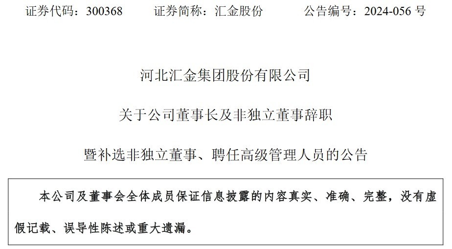 汇金股份(300368)于5月24日发布晚间公告称,河北汇金集团股份有限公司(以下简称“公司”)董事会近日收到公司董事长韩春丽女士、非独立董事刘红女士的书面辞职报告。韩春丽女士因工作调整原因申请辞去公司董事长、战略委员会主任委员、审计委员会委员、提名委员会委员,辞职后,继续担任公司非独立董事职务;刘红女士因个人原因申请辞去公司非独立董事职务,辞职后将不在公司担任任何职务。根据相关法律、法规、规范性文件和《公司章程》等有关规定,韩春丽女士、刘红女士辞职不会导致公司董事会成员低于法定最低人数,韩春丽女士、刘红女士的辞职报告自送达董事会之日起生效,其辞职不会影响公司正常经营。 公司于 2024 年 5 月 24 日召开了第五届董事会第十六次会议,审议通过了《关于补选毛世权先生为公司非独立董事的议案》《关于补选肖鸿飞先生为公司非独立董事的议案》。 为保障公司董事会正常运作,公司控股股东邯郸市建设投资集团有限公司向公司出具《推荐函》,经公司董事会提名委员会审核通过,公司董事会同意毛世权先生、肖鸿飞先生(简历详见公司于同日在巨潮资讯网站上披露的《第五届董事会第十六次会议决议公告》)为公司第五届董事会非独立董事候选人。 公司于 2024 年 5 月 24 日召开第五届董事会第十六次会议,审议通过了《关于聘任高级管理人员的议案》,经公司董事会提名委员会提名并审核通过,董事会同意聘任肖鸿飞先生(简历详见公司于同日在巨潮资讯网站上披露的《第五届董事会第十六次会议决议公告》)为公司副总经理,任期自董事会通过之日起至第五届董事会届满之日止。本议案已经第五届董事会第六次独立董事专门会议审议通过。